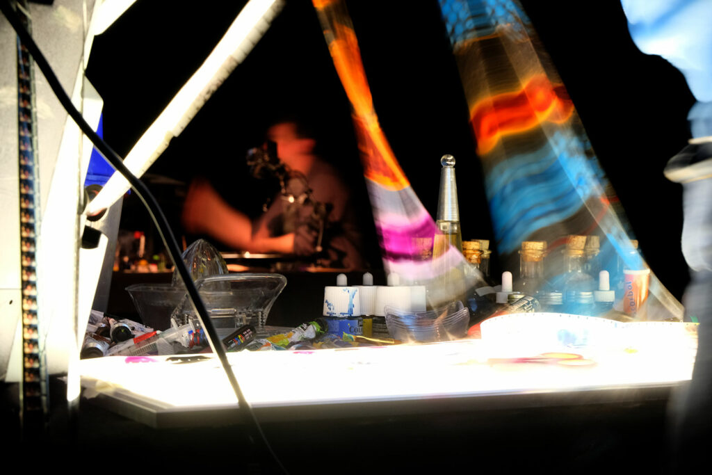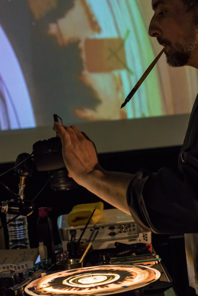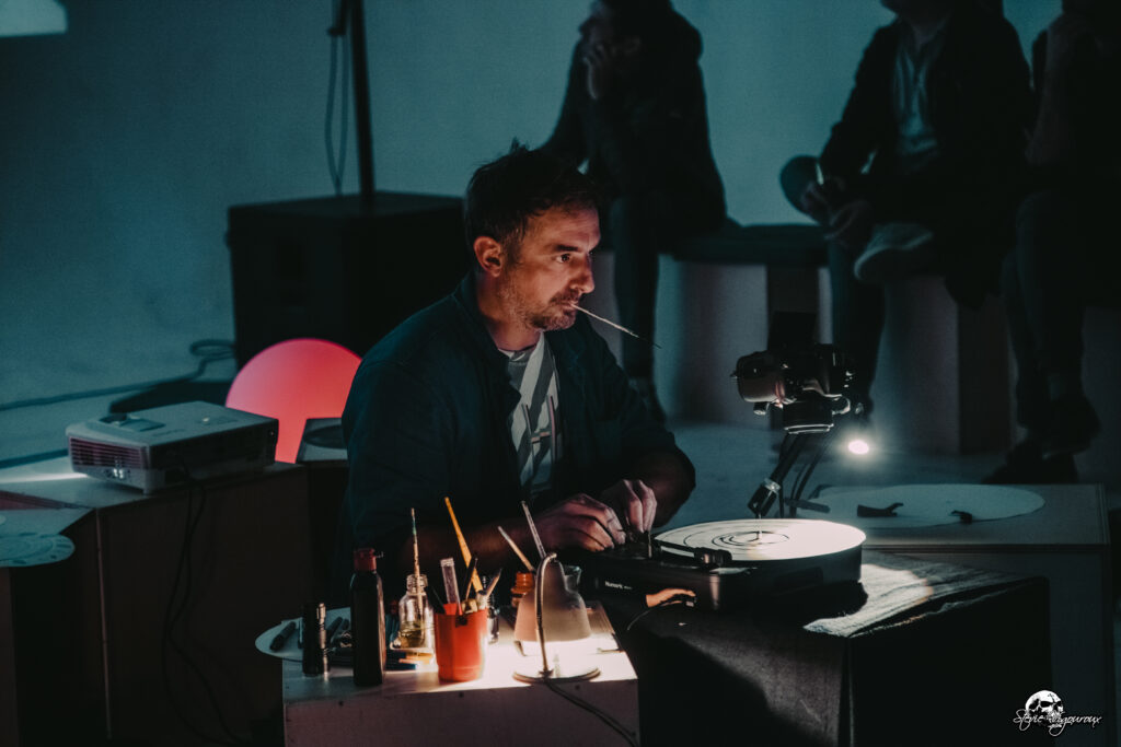 NikodiO vient avec sa platine et son mini atelier de fabrique de dessin animé pour inventer des disques phonotropic en direct.
