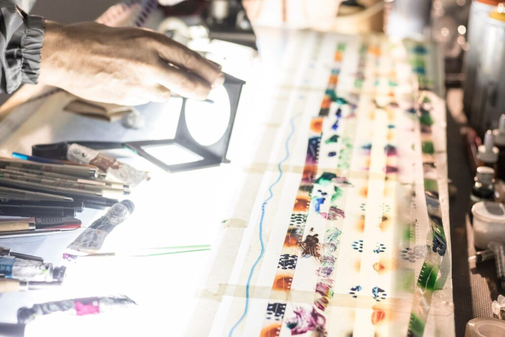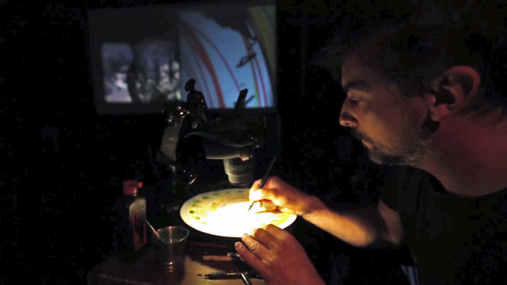 Les deux artistes jouent de leur images pour fabriquer un voyage a double temporalité. Un dyptique mêlant grattage sur pellicule et dessin animé sur phonotrope.